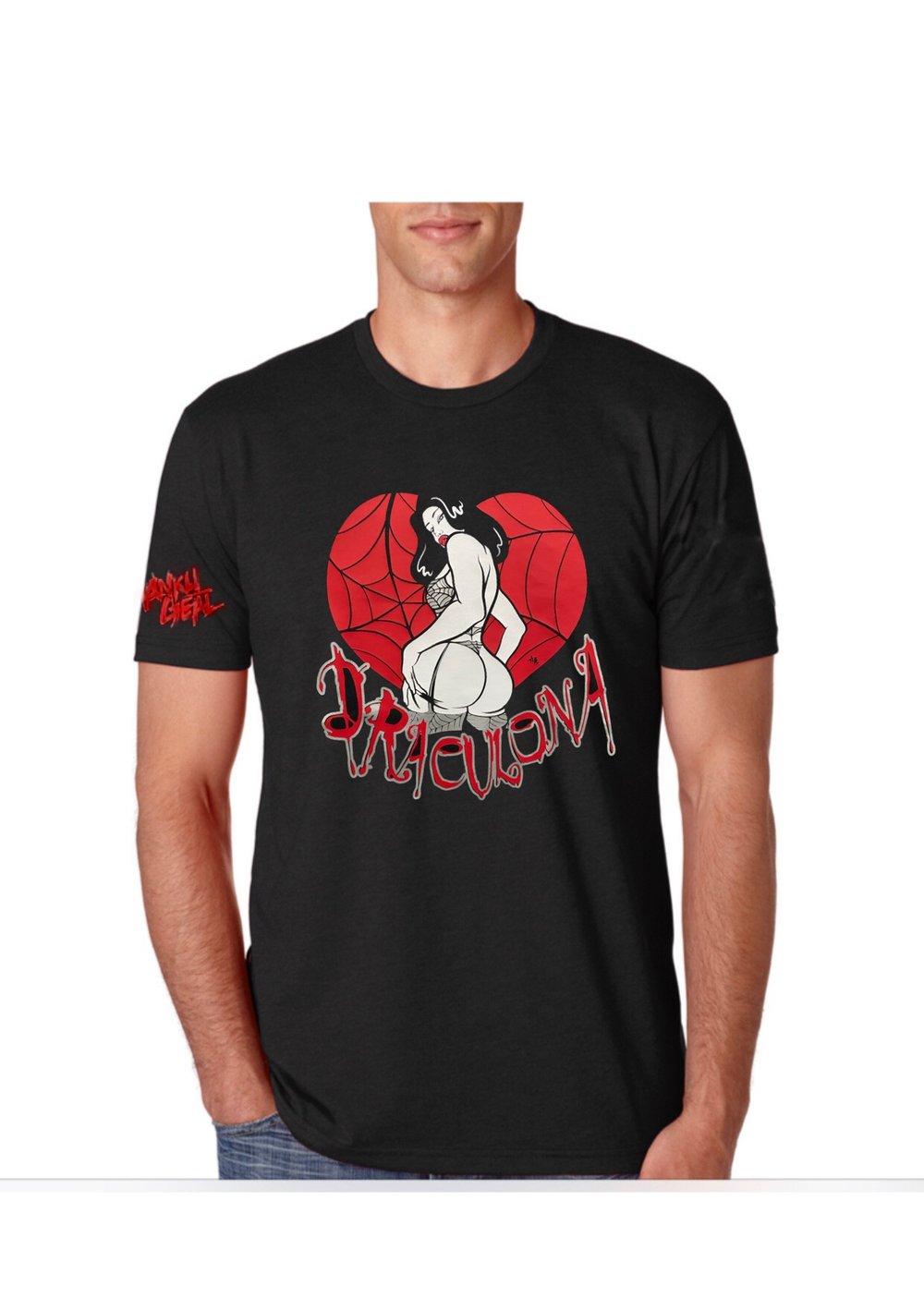 Draculona design by artist Miss Black Valkyrie on men’s black tee. Swipe for measurements. Comfortable and Breathable fabric.Machine Cold Wash/ No Bleach/ Hang Dry.
