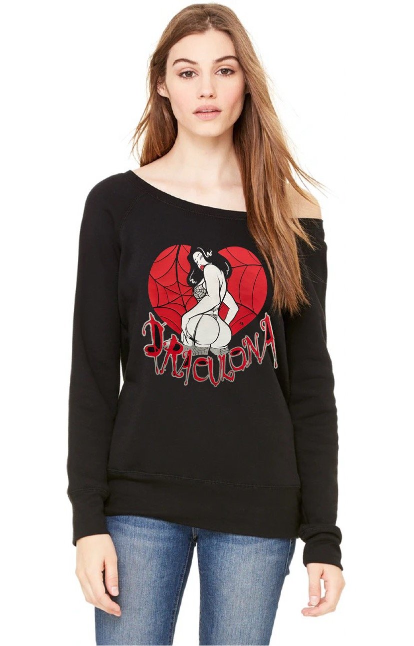 Draculona design by artist Miss Black Valkyrie on black off shoulder sweater.