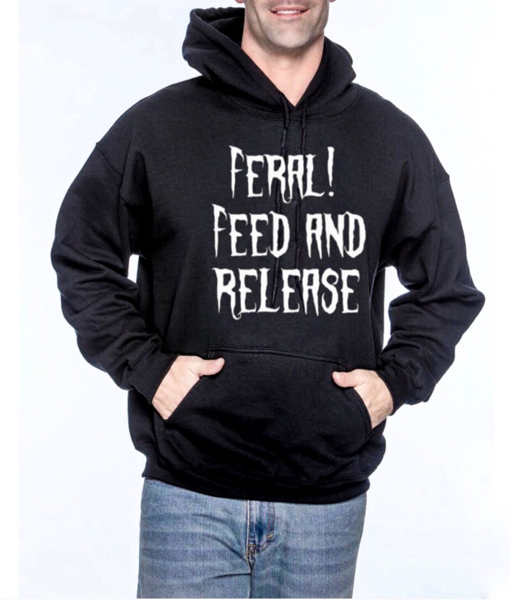 Feral Kitty design on unisex pullover hoodie. Swipe for measurement. Comfortable and Breathable fabric.Machine Cold Wash/ No Bleach/ Hang Dry.
