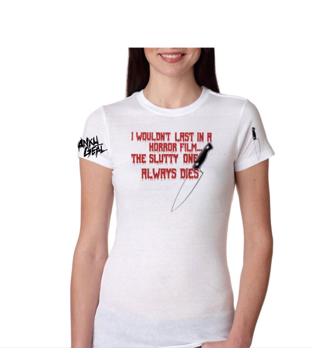 “I wouldn’t last in a horror film... the slutty one always dies” design on white tee. Swipe for measurements.Comfortable and Breathable fabric.Machine Cold Wash/ No Bleach/ Hang Dry.
