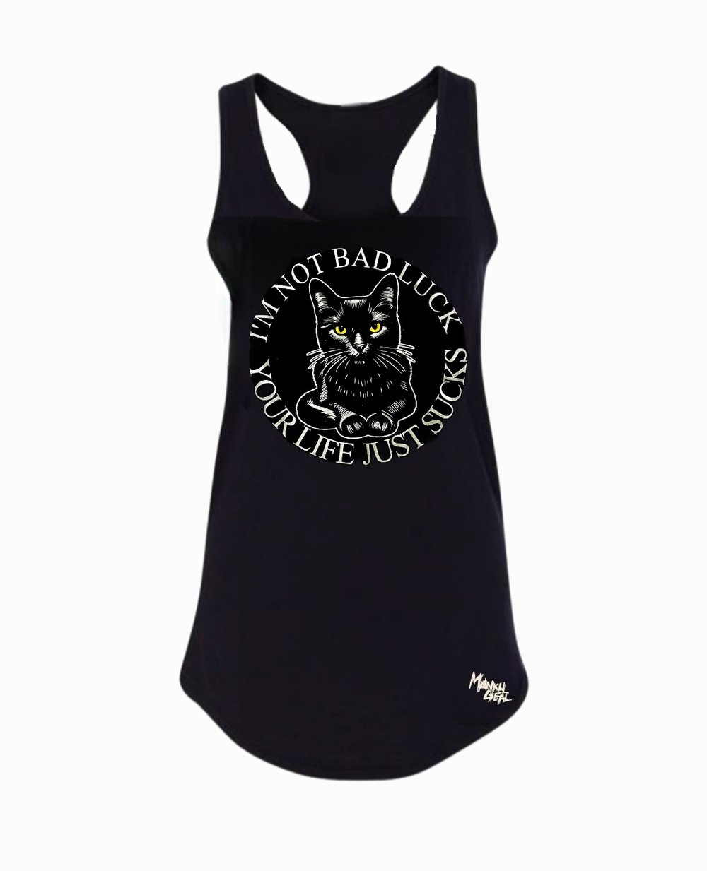 Lucky Kitty design on a black Racerback Tank Top. Swipe for Sizing Chart. 10% Donated to Cat Shelters. Features: