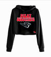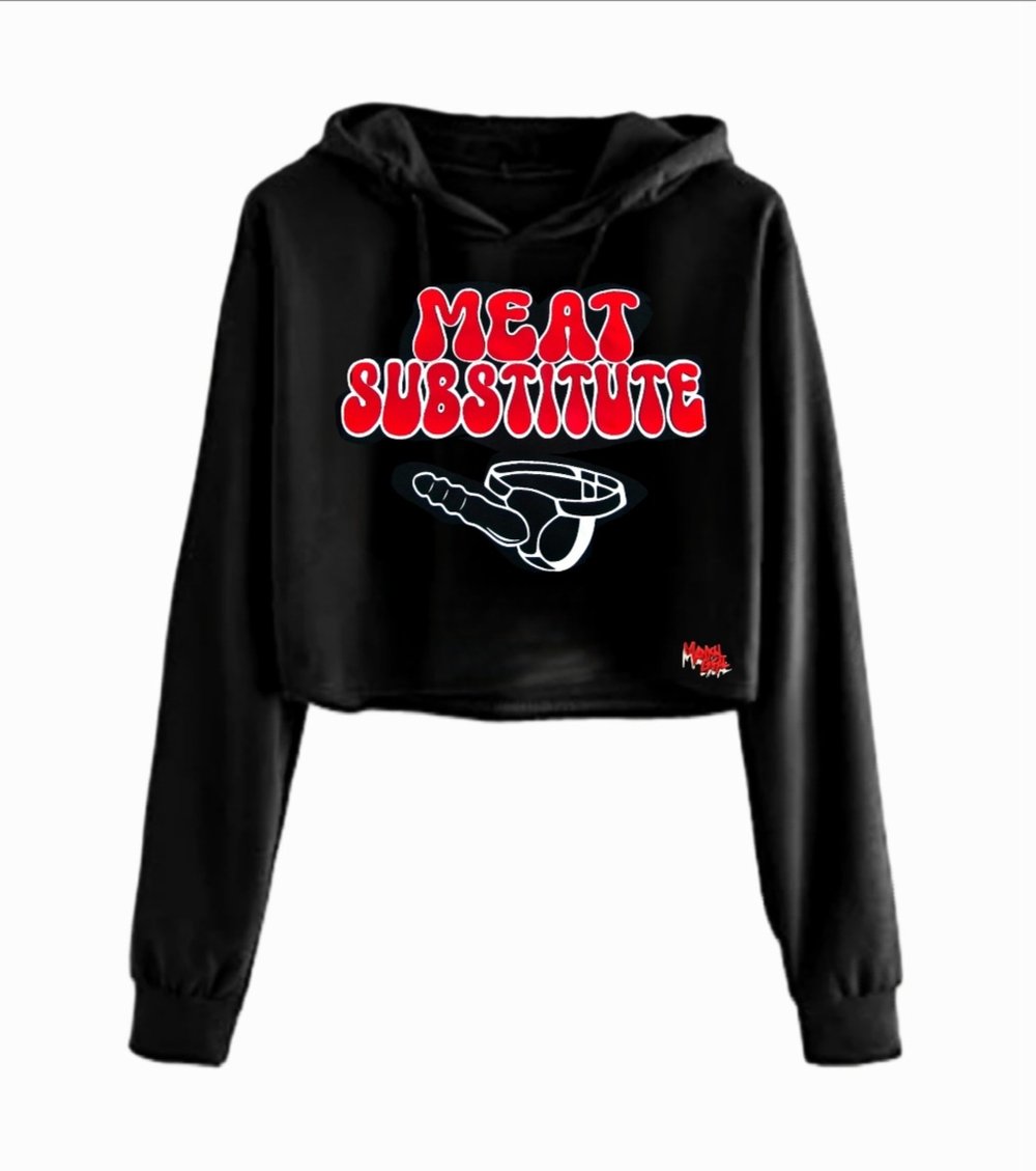 Meat Substitute design on black cropped hoodie. Cozy, oversized fit. Swipe for measurements. Long Sleeve, Drawstring Hooded Crop Top, soft and comfortable.