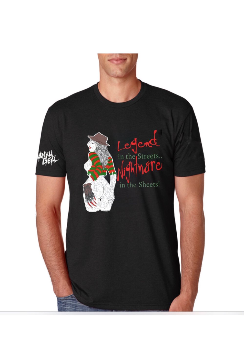 Nightmare In The Sheets design on men’s black tee. Original artwork by artist Jade Huntsvick. Swipe for measurements. Comfortable and Breathable fabric.Machine Cold Wash/ No Bleach/ Hang Dry.