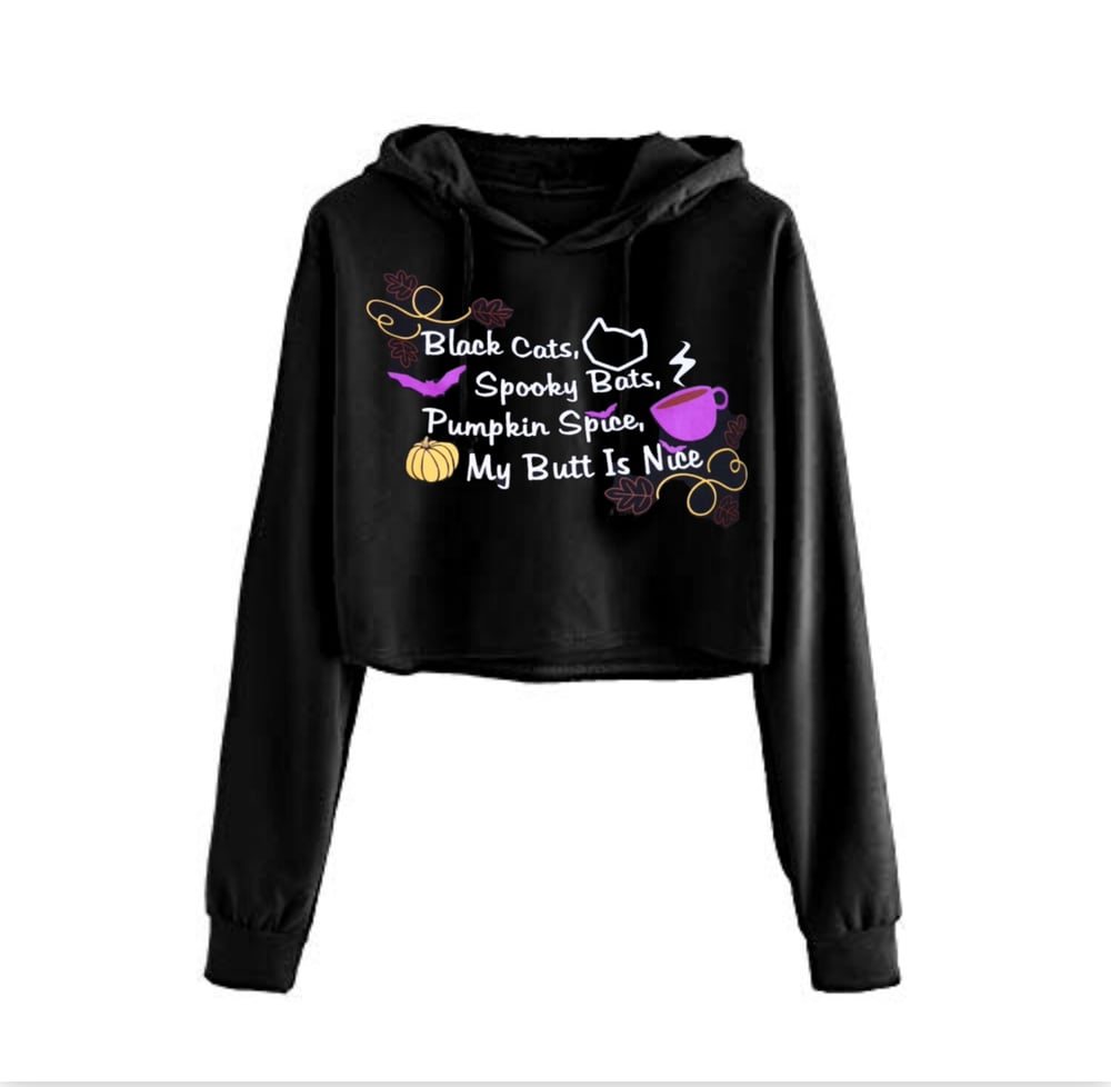 Pumpkin Spice, Butt Is Nice design on black cropped hoodie. Cozy, oversized fit. Swipe for measurements. Long Sleeve, Drawstring Hooded Crop Top, soft and comfortable.