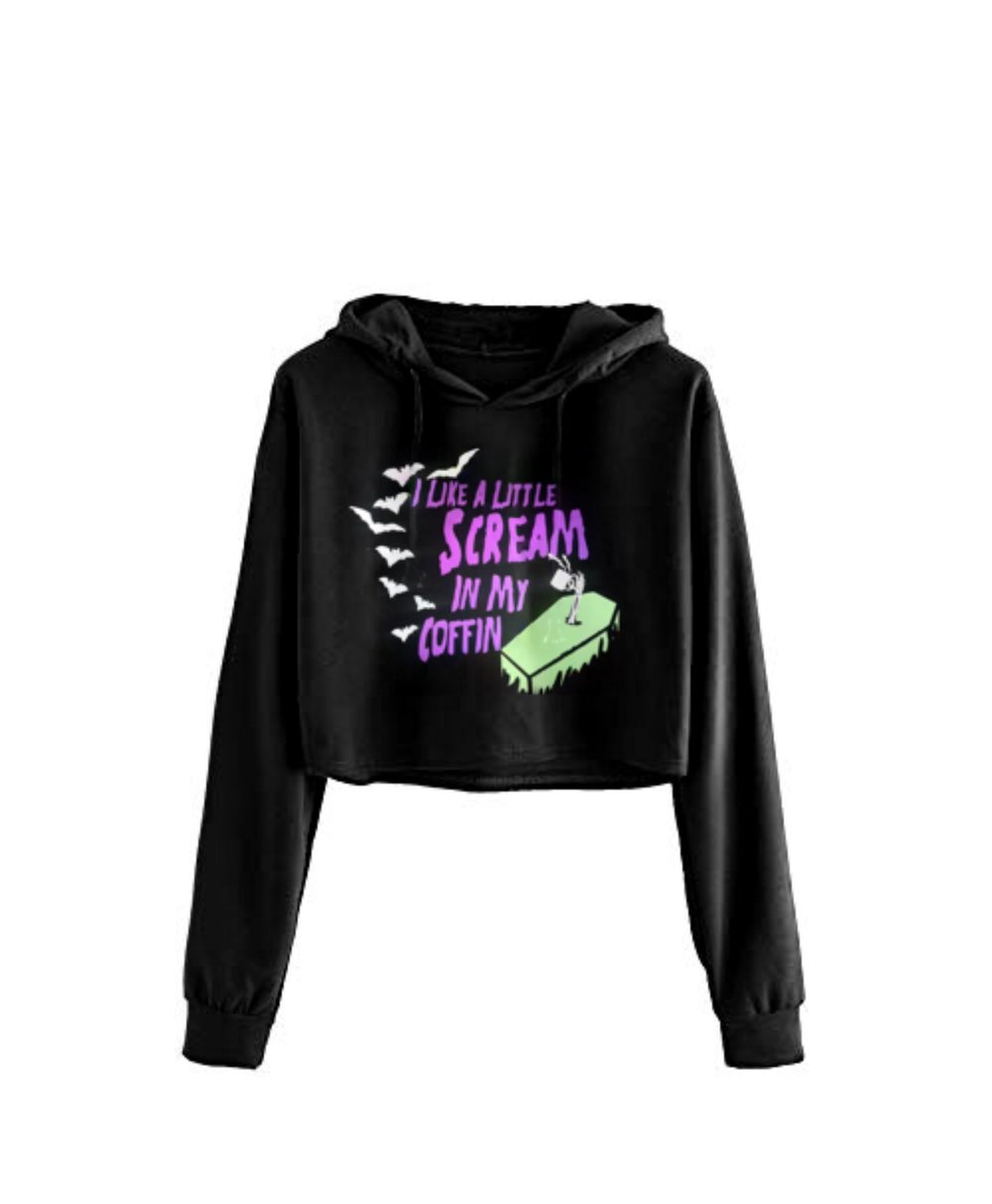 Scream In My Coffin design on black cropped hoodie. Swipe for measurements. Long Sleeve, Drawstring Hooded Crop Top, soft and comfortable. Large cozy, oversized fit.