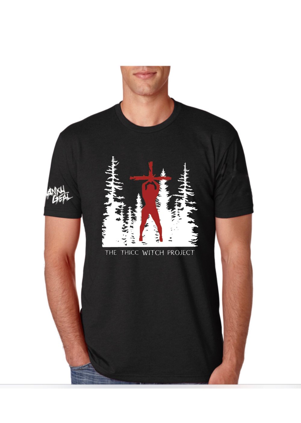 The Thicc Witch Project design on men’s black tee. Swipe for measurements. Comfortable and Breathable fabric.Machine Cold Wash/ No Bleach/ Hang Dry.